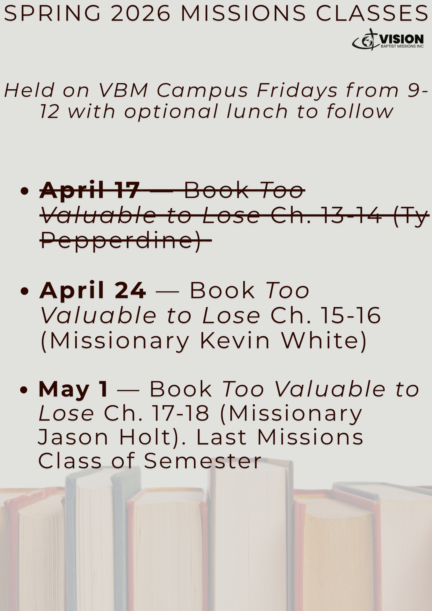 Below is the list of the final two Missions Classes -- please join us if you are anywhere close. Classes are held on campus from 9-12 on Fridays. The teachers, topics, and dates are listed below.